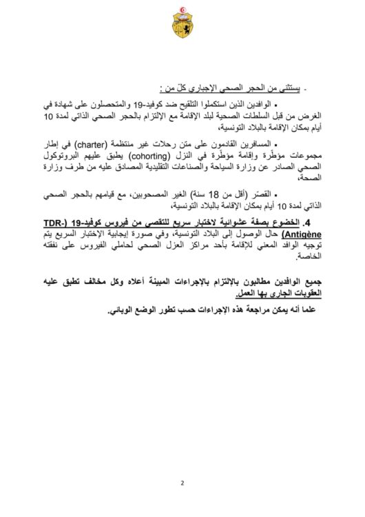 - S’engager à accepter un potentiel test antigénique rapide à l’arrivée en Tunisie ;