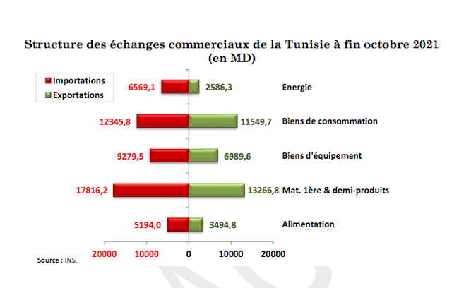 Tunis, — La balance commerciale alimentaire a enregistré au cours des dix premiers mois de l’année 2021 un déficit de 1.699,2 MD contre 619,5 MD durant la même période l’année dernière ; enregistrant ainsi, un taux de couverture de 67,3% en 2021 contre 86,7% en 2020.